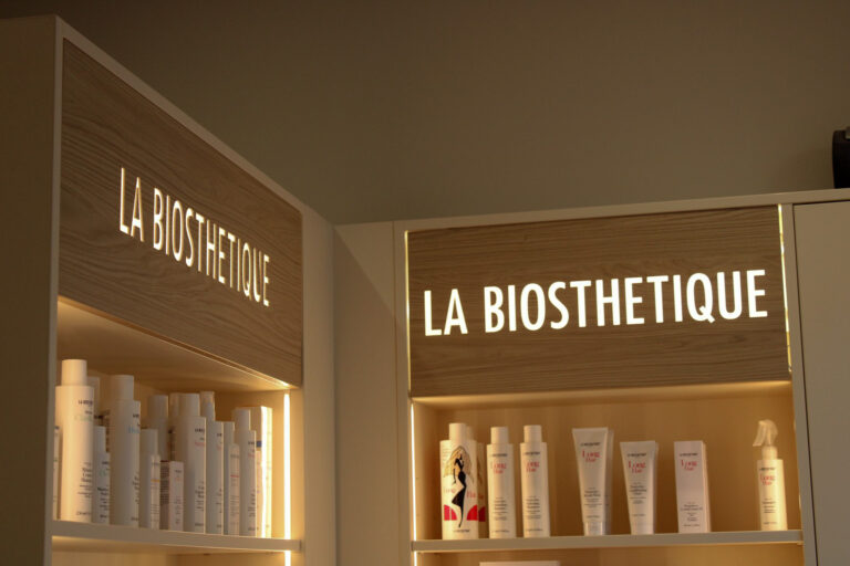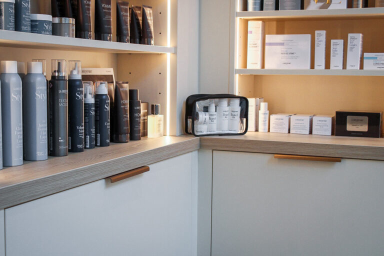 Dans le cadre de ce projet, nous avons conçu et fabriqué sur mesure l’ensemble du mobilier du salon, comprenant une banque d’accueil, des postes de coiffure, un meuble vasque dédié aux lavabos et aux produits, ainsi qu’un présentoir de produits La Biosthétique.